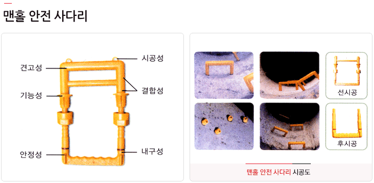 최근 대형택지 개발 및 하수처리장 공사로 맨홀 및 구조물에 적용되는 발디딤 사다리의 사용이 증가되고 있는 추세이나 시공상 안전도 및 시공성 등의 문제점을 안고 있어 당사에서 설계하여 자체 개발한 특허품으로 각종 구조물 시설에 안정성과 실용성을 가진 반영구적인 최상의 발디딤 사다리 제품입니다.